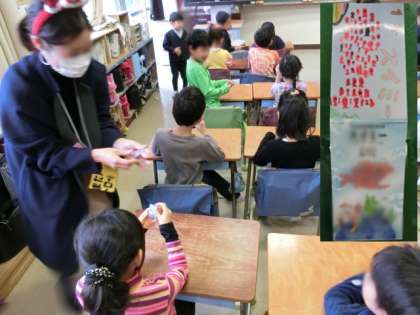 絵本を読んでいただいた後には、なんと「お母さんサンタさんたち」から子どもたちにプレゼントをいただきました。とてもすてきなスイミーのしおりです。ページを挟んで使うように、裏には磁石が付いています。