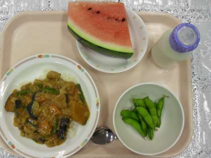 今日のメニューは「夏野菜のカレーライス、枝豆、スイカ、牛乳」でした。一学期最後の給食、みんないっぱい食べました。