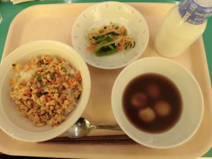 給食では、おもちのかわりに手作りの白玉を使った白玉しるこを出しました。