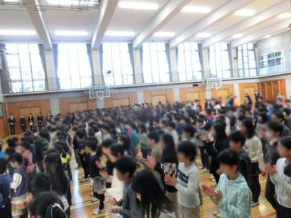 始業式のために体育館に集まった子どもたちは、いつもどおり、始業式が始まる時刻になるまで、静かに待つことができました。玉堤の子どもたちの素晴らしいところの一つです。
