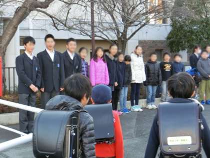 尾山台中学校の先輩たちと、運営委員や代表委員、5年生、保護者の方々が一緒に校門に立ち、あいさつ運動が始まりました。元気のよいあいさつの声が響きました。