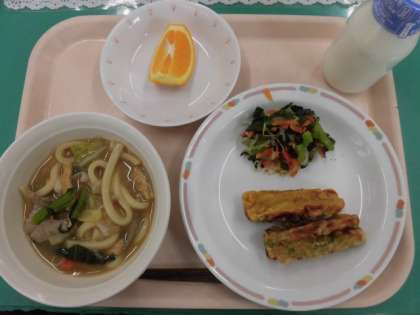 あおのりの磯の香りと、カレーのスパイシーな味がする2つの味でした。今日はうどんの量が多くボリュームがありましたが、ちくわの2色揚げもよく食べていました。