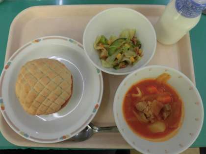 今日はロシアやウクライナでよく食べられているスープ「ボルシチ」を出しました。ボルシチの特徴は鮮やかな赤色をしていることです。これはビーツという野菜を使っているためです。給食ではビーツを手に入れることができなかったため、トマトピューレなどで代用し、ボルシチ風のスープに仕上げました。
