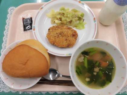 今日はえほん給食第2回目でした。今日の絵本は「あほうどりと11ぴきのねこ」でした。11ぴきのねこたちが作るサクサクのコロッケを目指して給食室でも作ってみました。パンの形をはさんで食べられるようにしたので、コロッケバーガーにして食べる子、別々に食べる子など、それぞれが楽しんで食べていました。