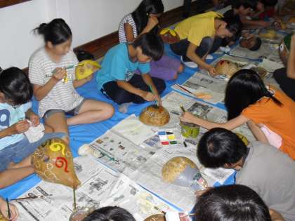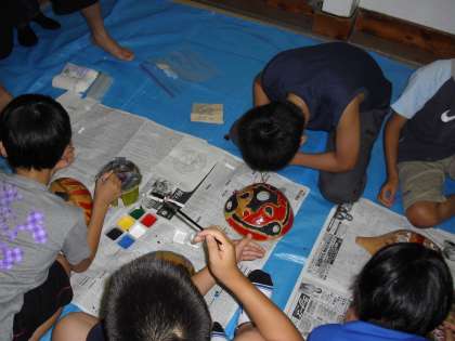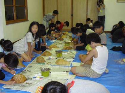 かんぴょうやひょうたんを乾燥させた皮に絵を描いて装飾品にしたものです。作られている方にお越しいただいて、説明をしていただき、いよいよ作成開始です。