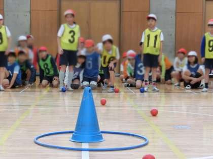 実際に、全員がボールを投げてみました。的は、三角コーンです。何回か投げてみるとだんだんと的の近くに投げられるようになり、喜ぶ声が大きくなっていきました。