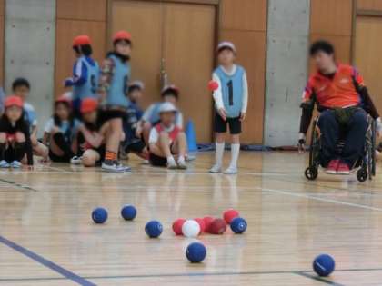 そして、代表のお友達24人が、ジャックボール(白)を的にしてゲーム形式で挑戦しました。お友達が投げる一球、一球に歓声があがりました。2人の選手からは、直接アドバイスをいただきました。