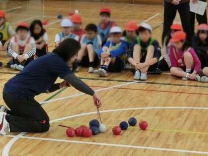 オリンピック・パラリンピック教育の一環として、パラリンピックの種目でもある「ボッチャ」の選手(Noble Wings)お2人と関係者の皆様をお招きして、ボッチャを体験させていただきました。ボッチャは、的であるジャックボール(白)にいかに赤・青の球を近づけるかで勝負する競技で、カーリングに似ているところがあります。男女、年齢を問わず楽しむことができます。