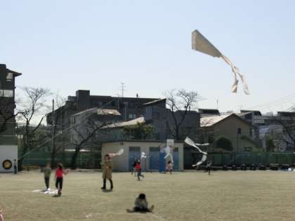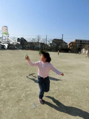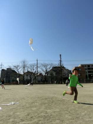多摩川の河川敷に行くことができなかったので、1年生は校庭でたこあげをしました。