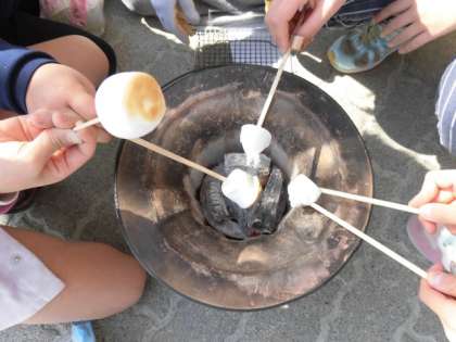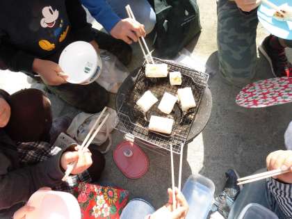 活動後の振り返りでは、「大変だったけど、いつもよりおもちが美味しく感じた。」「七輪は焼いたりあぶったり、いろいろな使い方ができて便利だと思った。」と感想が聞かれました。大変さの中にも、七輪の良さに気付くことができたようです。昔の道具の使い方だけでなく、それぞれの良さや不便さを体験でき、昔の人の思いにふれることができた体験となりました。