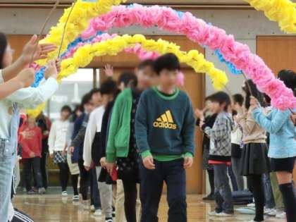 6年生が花のアーチをくぐりながら入場し、送る会が始まりました。会は、これから玉堤を代表する現5年生の司会ですすんでいきます。