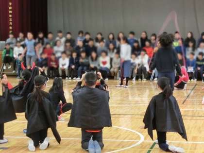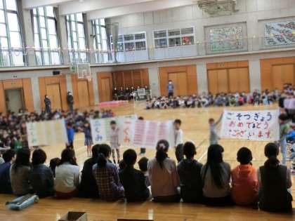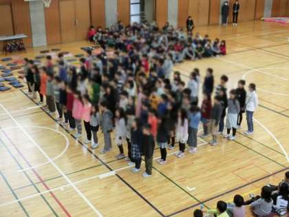 3年生は、6年生の代表と二重跳びで勝負しました。さすが!!6年生の勝利。そして「ビリーブ」を歌いました。