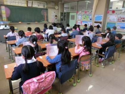 今日は、音楽で1年生を迎える会で歌う2曲を練習しました。3クラスともとても元気に歌っていました。