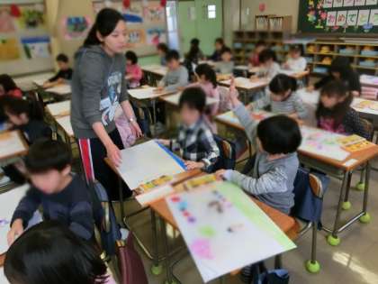 図工の学習「すきなもの いっぱい」。クレパスで桜や学校、飛行機、果物……自分の好きなものを画用紙にかきました。