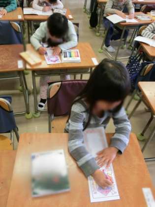 残った時間で、「はじめてかいた なまえ」に、クーピーで色を付けて仕上げもしました。