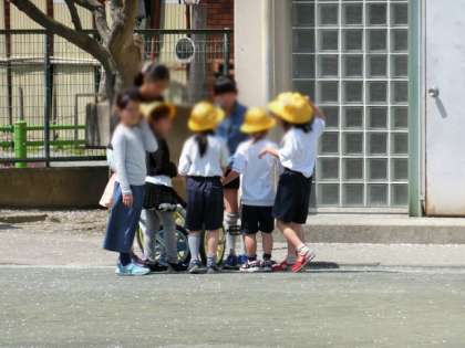 黄色い帽子がキラキラしている校庭でした。
