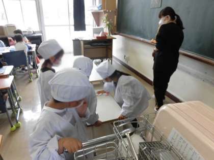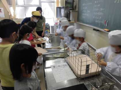 配膳は、給食当番がします。初めてなので、担任の先生や補助の先生に教えていただきながら慎重にすすめました。配膳してもらい、自分の席に戻るお友達も、落とさないよう慎重に慎重に運んでいました。