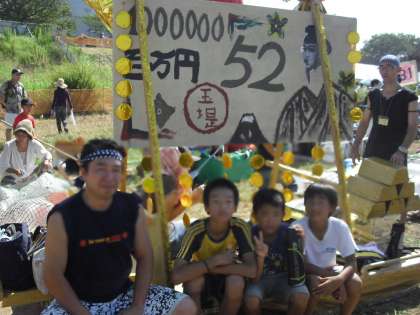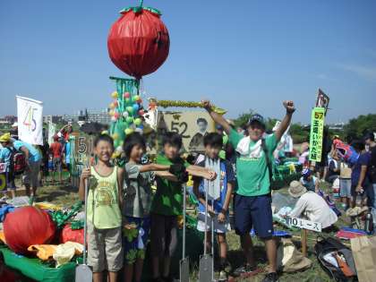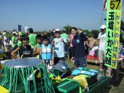 29日残暑厳しい本日、第13回のアドベンチャーイン多摩川が行われ、本校もおやじの会の皆様が中心となり、5年生が3艇参加しました。いかだ組 トマト号、河童号、100万ドル?号と、個性豊かないかだで子どもたちと、おやじの会、そして、5年生の担任が参加しました。出発前は、意気揚々でしたが、流れに悪戦苦闘で、ゴールを目指して力一杯漕いでいました。