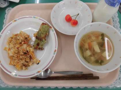 今日は今が旬の果物、さくらんぼでした。今の時期した食べることのできない旬の果物の美味しさを味わってもらいたいと思います。キムチチャーハンは1年生には辛いかと心配しましたが、よく食べていました。