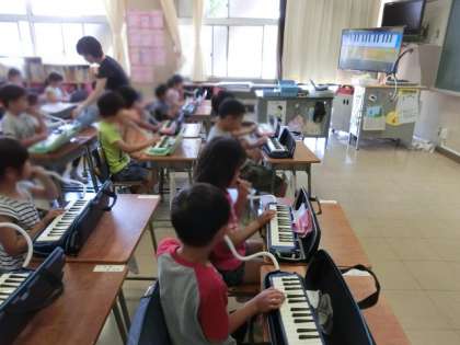 まずは、1年生の学習です。音楽「けんばんハーモニカを ふこう」 国語「かいて つたえよう」 算数「たしざん(1)」