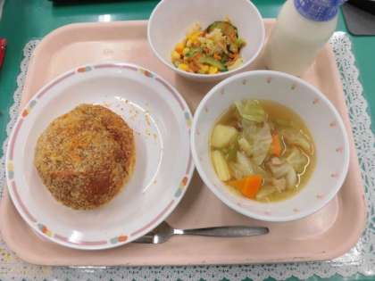 今日の焼きカレーパンは、揚げて作るのではなく、オーブンで焼いて作るのでヘルシーなカレーパンでした。パン粉に油をまぶし、オープンで焼いて焦げ目をつけたものをパンにつけることで揚げたようにみえます。今日は遠足が中止になった5,6年生に食べたかった〜と言われました。今度は5,6年生がいる時に作りますね。