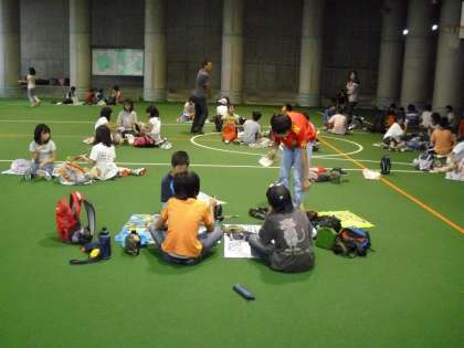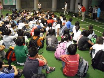 まだ、歴史の学習に慣れていませんが、昔の生活の様子や戦前の小学生のことが分かりました。歴史民俗資料館を後にして、宿舎の世田谷区民健康村のなかのビレッジに着き、同じく若林小学校の5年生と開室式を行い、昼食を取り、部屋に入りました。台風9号の影響でジャガイモ堀を延期し、様子を見ていましたが、雨がほとんど止んできたので、飯盒炊飯の用意に入りました。