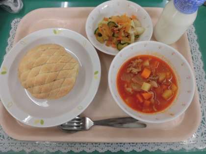 メロンパンは少しクッキー生地やパンの周りが固くなるので、歯がぐらぐらとしている低学年の子は少し食べづらそうでしたが、甘いパンのなのでどの学年もよく食べていました。