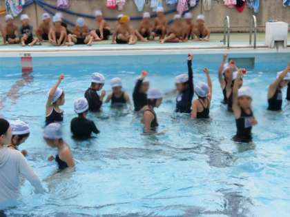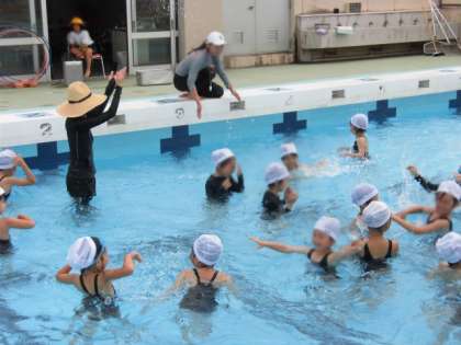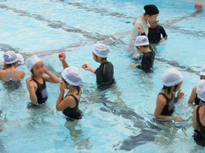 まだ顔がつけられない子たちもゴーグルをはずして元気に水中を走ったり、水を掛け合ったりしました。はじめは顔をしかめていた子たちも、たくさん水を浴びながら顔に水がかかることに慣れていくことでしょう。