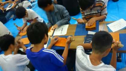 鏡や鉛筆立て、写真立てなど、選んだ小物は様々です。木彫りの里の職人の方々のご指導を受けながら、用意してきた下絵を写し、その上から専用の道具で掘っていきます。細かな線をはっきり出すのは、簡単ではありません。