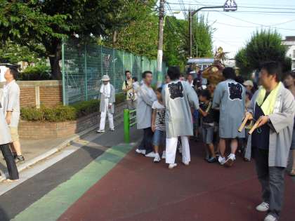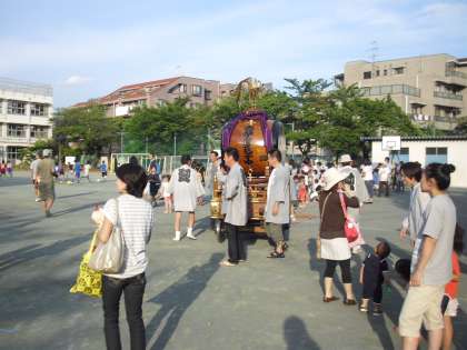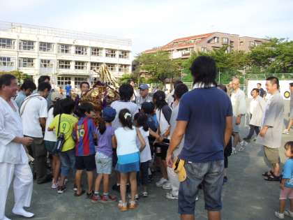 PTAの会長はじめ、役員の皆様のお手伝いをいただき、神輿の休憩場として、お立ち寄りをいただきました。子どもたちも最後の等々力不動尊に戻る前の休みの場として、飲み物と果物をいただきました。明日は、大人の神輿がやってきます。