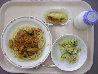 今日のメニューはナスのトマトソーススパゲティー、アーモンドサラダ、スイートポテト、牛乳でした。