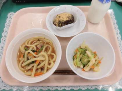 今日はお彼岸メニュー「おはぎ」が出ました。給食室で手作りをしたあんをつつみ、きな粉をかけて仕上げました。