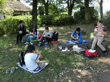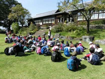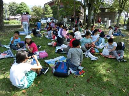 内部を見学し、資料館前の草原で昼食となりました。お家の方がつくってくださったお弁当はどれもとても美味しそう。この後いよいよふじやまビレジに向かいます。
