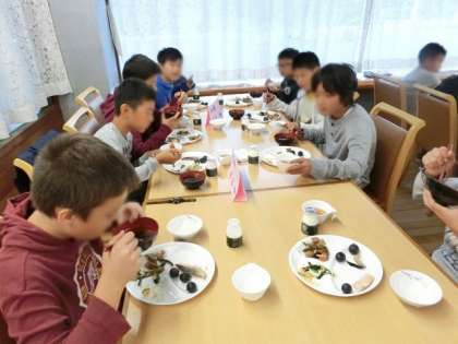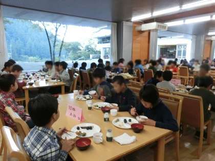 朝食の風景です。 窓の外には一面の緑が広がっています。気持ちのいい朝です。
