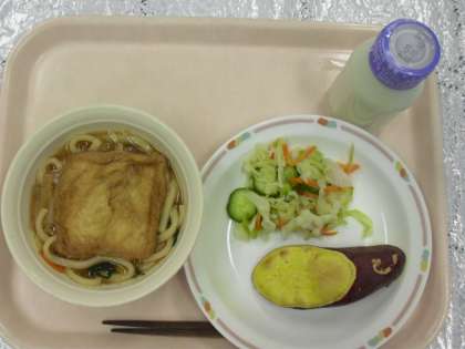 28日のメニューは、きつねうどん、野菜の甘酢かけ、焼き芋、牛乳でした。