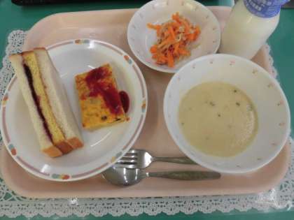 今日は目の愛護デーです。給食では目によいといわれているアントシアニンが多く含まれているブルーベリーを使ったジャムサンドを出しました。