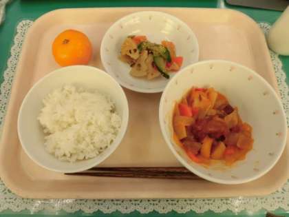 主な食材 米(秋田県・青森県)しょうが(高知県)じゃがいも(北海道)にんにく(青森県)人参(北海道)ピーマン(茨城県)玉ねぎ(北海道)赤ピーマン(高知県)黄ピーマン(山形県)大根(千葉県)れんこん(茨城県)きゅうり(埼玉県)みかん(愛媛県)