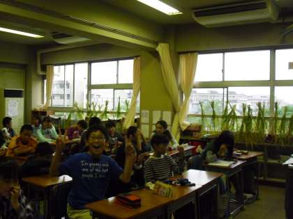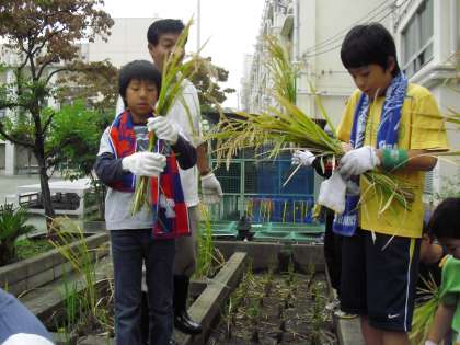 春先から5年生が育ててきた稲、たわわに実り、子どもたちが稲刈りをしました。2クラスとも刈った稲を教室で干しています。収穫量は?