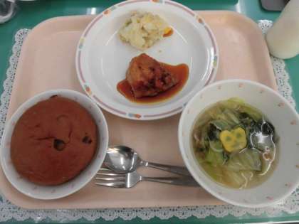 今日はえほん給食でした。「モンスターホテルでパーティーだ」より、はんぎょじんが焼いたお肉と3人の魔女のスープをだしました。3人の魔女のスープにはおばけかぼちゃが入っており、各クラスで「入ってた!!」「入ってなかった」と盛り上がっていました。