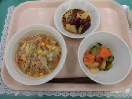 今日は旬のさつまいもを使った大学芋でした。大学芋は通常は油で揚げて作りますが、今日はオーブンで焼いて作りました。
