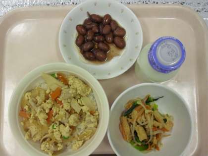 今日のメニューは、親子丼、野菜の味噌だれかけ、煮豆、牛乳でした。