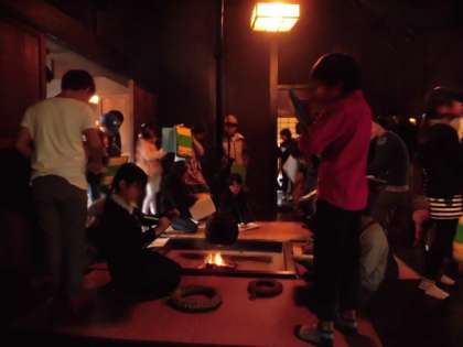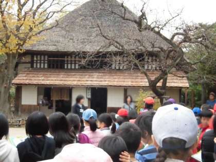最初に訪れたのは次太夫堀公園です。古民家の中に入り、昔の暮らしについての説明を受けながら見学しました。いろりでは火が燃えていました。