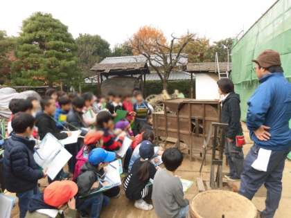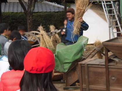 続いて昔の農家の稲作について、係の人に実際に農具を動かしてもらいながら説明を受けました。稲作りは、米をとるだけでなく、かご、わらじ、みの、俵など日常生活に必要なものをつくるためにとても重要だったことがわかりました。