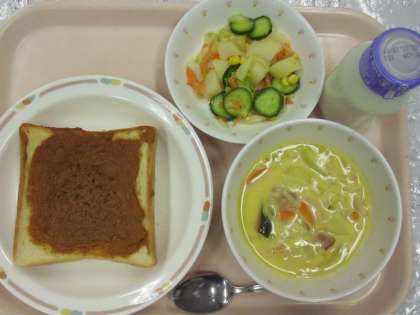 きな粉バタートースト、カボチャのクリームスープ、ポテト入りフレンチサラダ、牛乳でした。