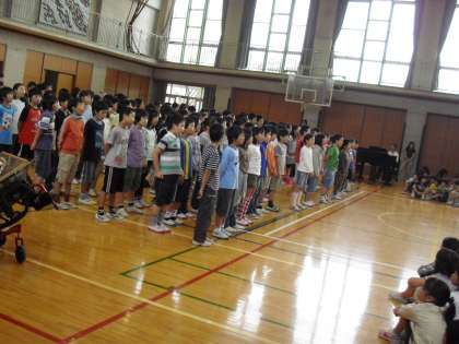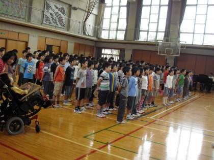 今日の音楽朝会で、5・6年生が、夢の世界を を全校の子どもたちの前で披露しました。音楽の時間に練習した成果を他の学年の子どもたちに伝えました。また、都立光明特別支援学校の副籍の友達も来校し、一緒に楽しみました。