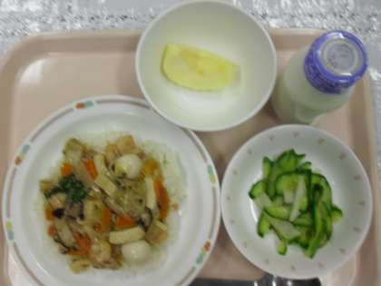 昨日は、中華丼、大根ときゅうりのゴマ風味、リンゴ、牛乳でした。