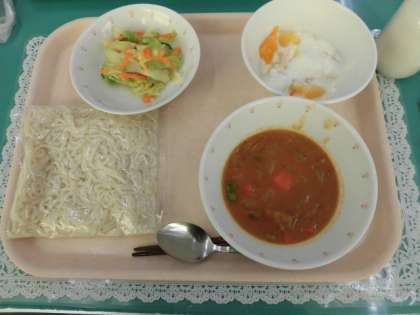 今日の給食は全国学校給食週間にちなみ、昔の給食としてソフトめんをだしました。