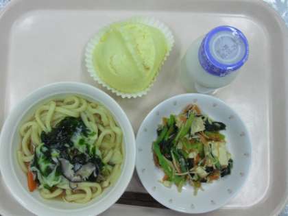 今日のメニューは、ワカメうどん、小松菜の煮びたし、サツマイモ蒸しパン、牛乳でした。