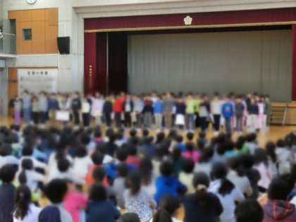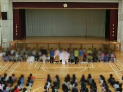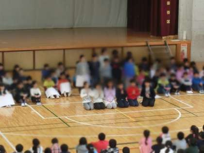 全校朝会で、4年生が日本語発表を行いました。「衣・食・住について調べよう」という単元で調べたことを台詞や演技などを取り入れて発表しました。発表では、浴衣と着物の違いや箱膳、障子や畳の効果など、江戸時代から昭和初期までの人々の暮らしや当時のマナーなどについて詳しく伝えることができました。