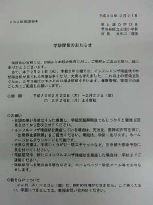 2年3組は、本日、インフルエンザ様症状やかぜ症状が見られる児童が多くなり、欠席が増えました。そのため、明日22日(木)〜23日(金)の2日間、学級閉鎖を行います。健康管理、家庭での過ごし方にご配慮をお願いします。